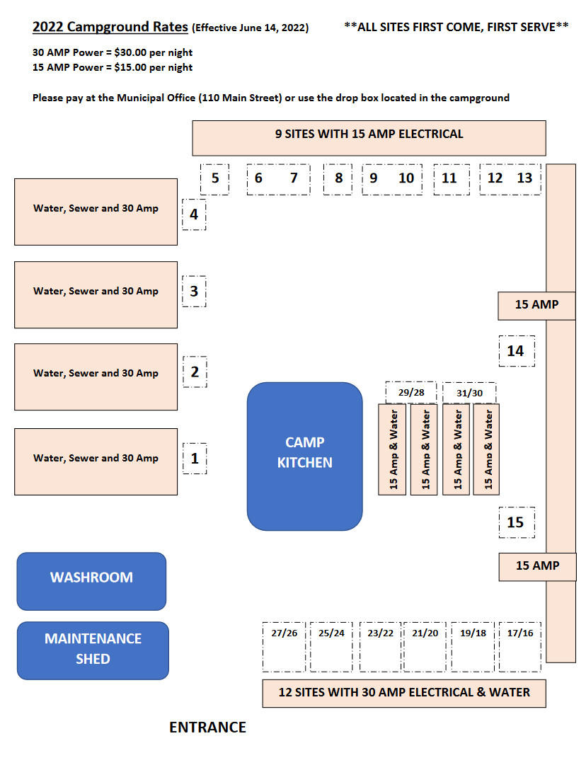 Campsites are first come first serve. At this time, the Village Office does not take reservations.